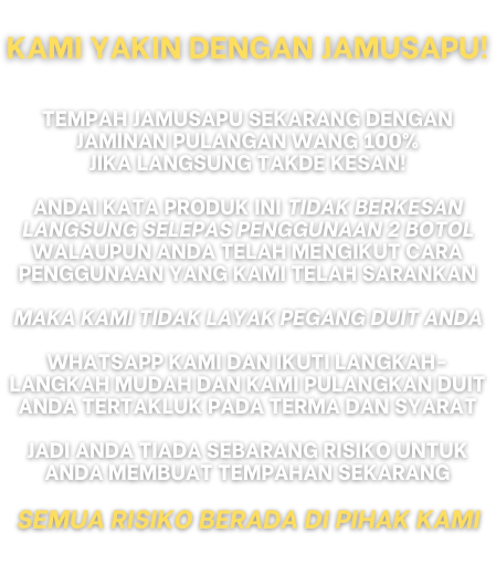 WE ARE COMMITTED TO PROVIDING HIGH-QUALITY PRODUCTS THAT MEET YOUR SATISFACTION. SUPPOSE FOR ANY REASON YOU ARE NOT COMPLETELY SATISFIED WITH YOUR PURCHASE OF JAMUSAPU. IN THAT CASE, YOU MAY REQUEST A REFUND UNDER OUR MONEY-BACK GUARANTEE POLICY, SUBJECT TO THE TERMS AND CONDITIONS.